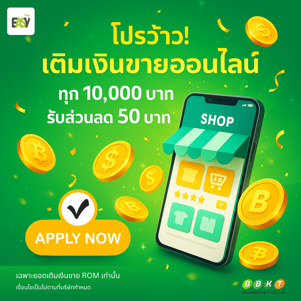 โปรว้าว! เติมออนไลน์ยิ่งเติมยิ่งคุ้ม เติมปุ๊บ ลดปั๊บ ทุก 10,000 บาท รับส่วนลด 50 บาท เติมยอดขายออนไลน์ให้ลื่นไหล 💚ทุกๆ ยอดเติม 10,000 บาท รับส่วนลด 50 บาท ไปเลย!เติมบ่อยก็ยิ่งคุ้ม—ร้านโต กระเป๋าก็แฮปปี้ 😉