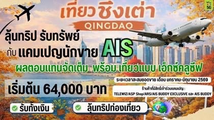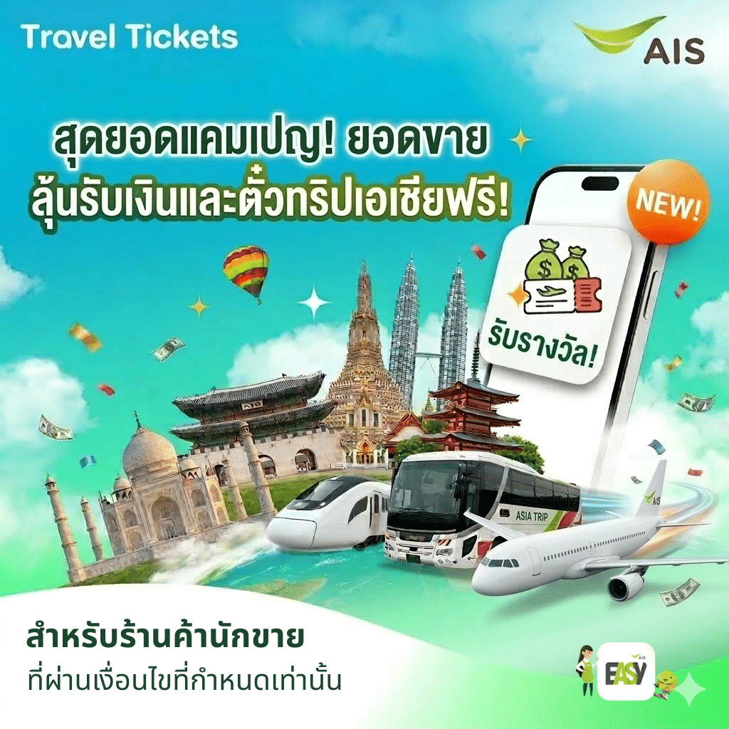 ลุ้นรับตั๋วเที่ยวฟรี ทั้งเงิน ทั้งทริปท่องเที่ยวทั่วเอเชีย เพียงผ่านเงื่อนไขการขายซิมที่ AIS กำหนด นอกจากรับผลตอบแทนมากมายแล้ว ยังได้ลุ้นตั๋วท่องเที่ยวสุด Exclusive