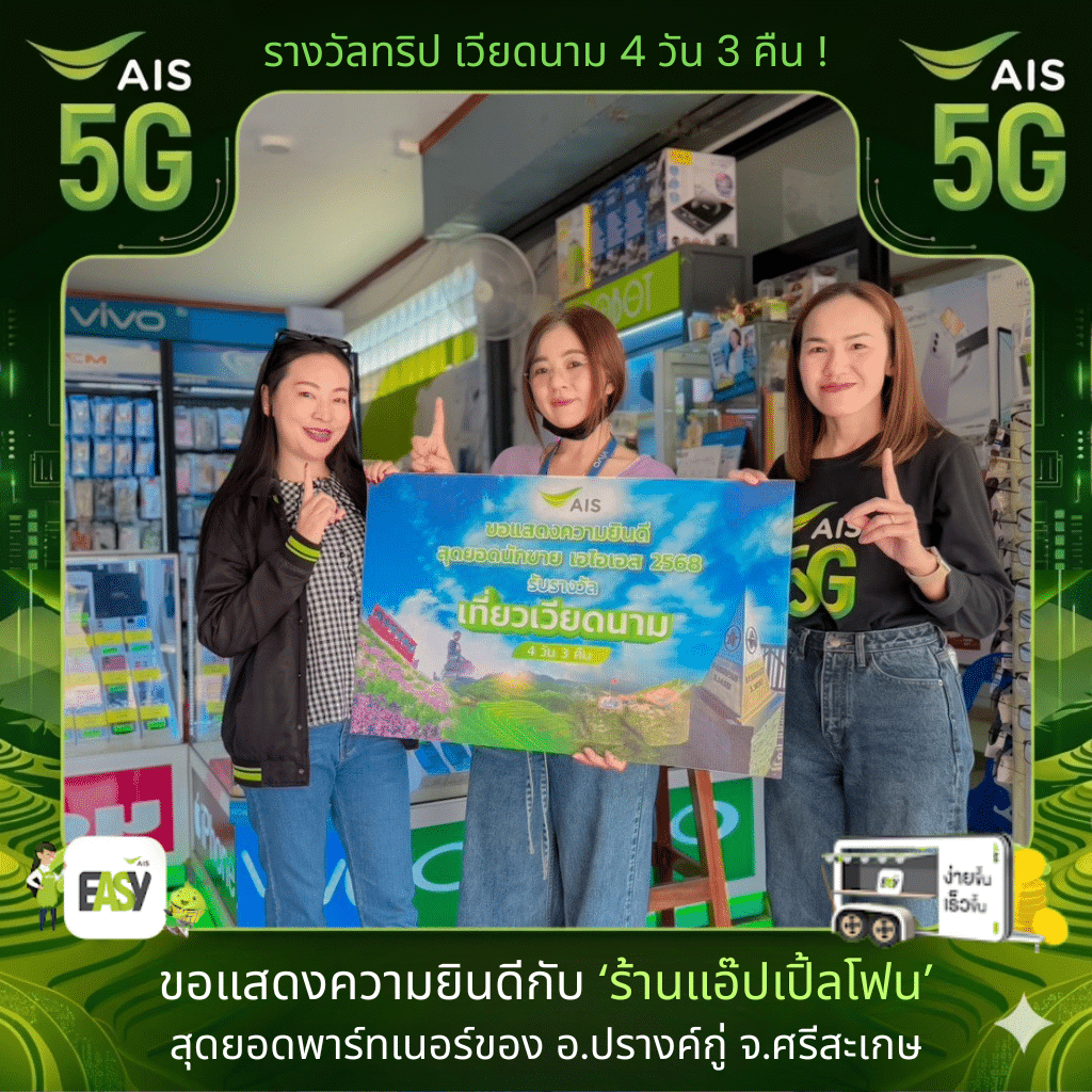 สุดยอดนักขายซิม รับตั๋วทริปท่องเที่ยวเวียดนาม 4 วัน 3 คืน ประจำปี พ.ศ.2568 ร้านแอ๊ปเปิ้ลโฟน อ.ปรางค์กู่ จ.ศรีสะเกษ